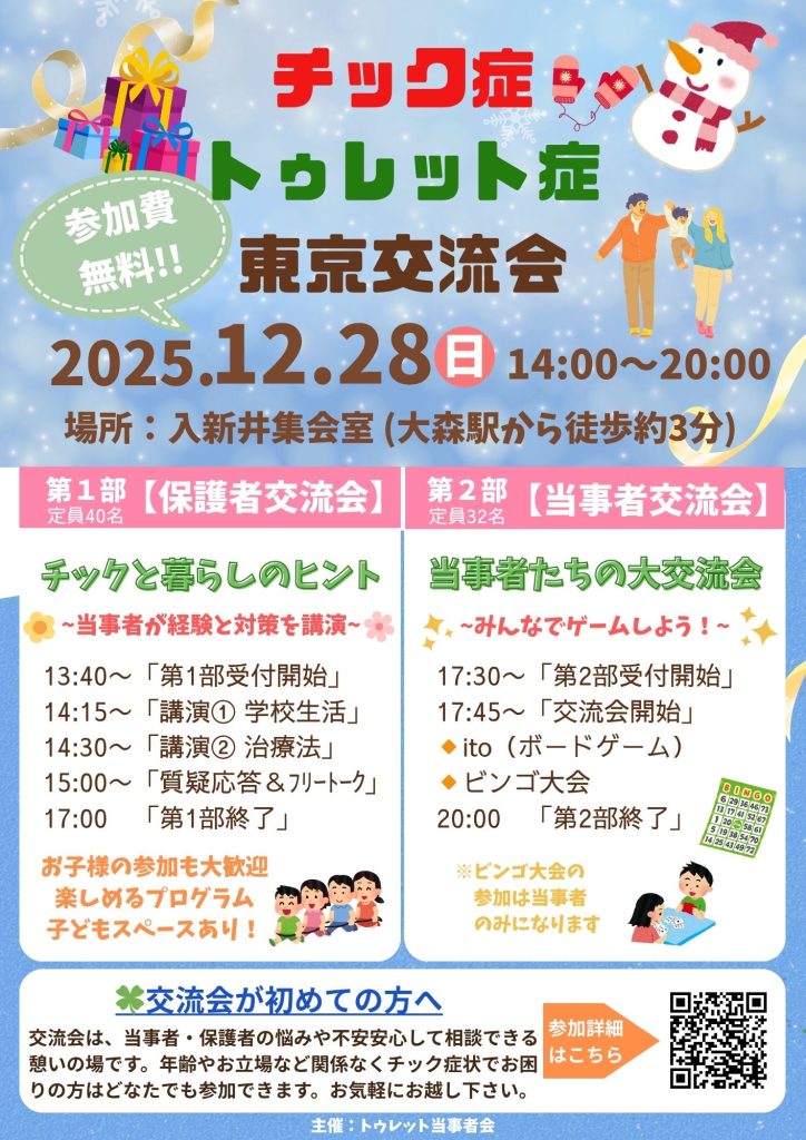 チック症トゥレット症交流会大阪 2025/06/28 チック症トゥレット症交流会東京 2024/12/28 チック症トゥレット症交流会横浜 2024/09/28 チック症トゥレット症交流会東北 2024/06/08 チック症トゥレット症交流会東京 2023/12/16 チック症トゥレット症交流会仙台 2023/09/23 チック症トゥレット症交流会名古屋 2023/05/14 チック症トゥレット症交流会大阪 2023/03/19 チック症トゥレット症交流会仙台 2023/03/18 チック症トゥレット症交流会東京 2022/11/19 チック症トゥレット症交流会横浜 2022/10/23 チック症トゥレット症交流会仙台 2022/09/11 チック症自己対処法勉強会 2022/07/17FacebookXBlueskyCopy